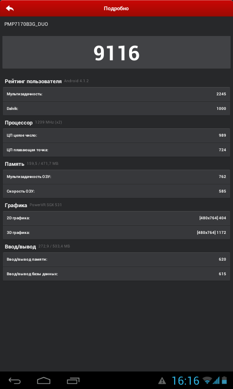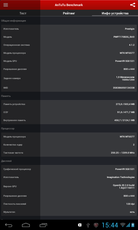 Т.к. изделие относится к разряду бюджетных, я решил не гонять на нём тонны бенчмарков, а обойтись AnTuTu Benchmark версии 4.1.1 Кстати, вот какую информацию он выдаёт о планшете Prestigio: