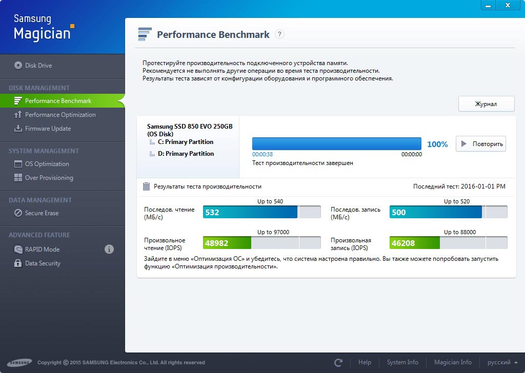 А теперь глянем, что же нам покажет фирменное П.О. для управления SSD от Samsung, речь о Magician, смотрим ниже: