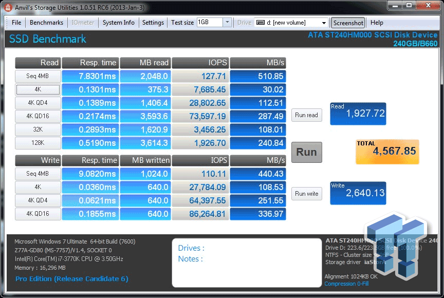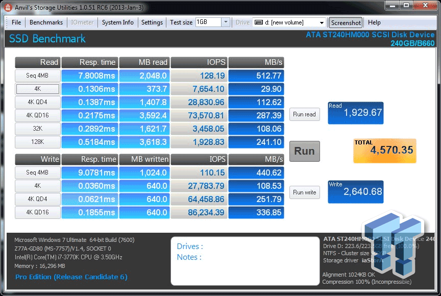 Далее Seagate 600 240ГБ был протестирован в Anvil's Storage Utilities - наборе утилит, созданном для того, чтобы владелец накопителя знал всё о своём кремниевом друге. Используемая в тесте версия утилиты - RC6.