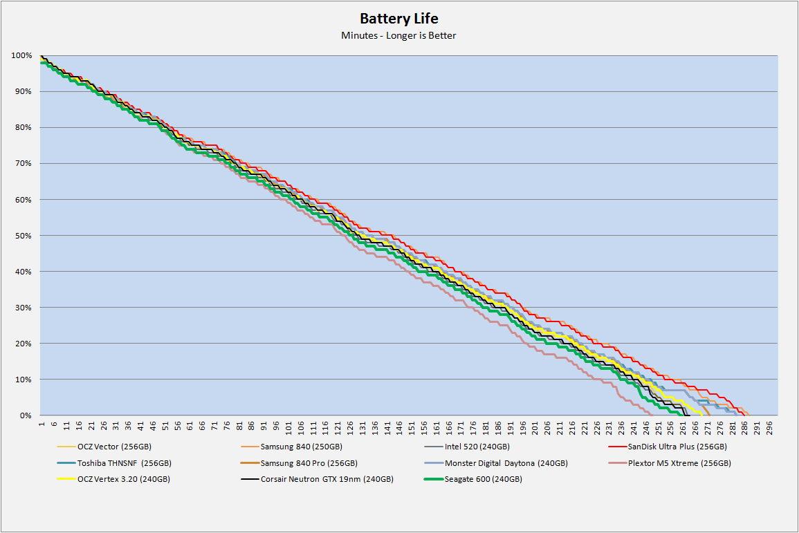 Если сравнивать Seagate 600 240ГБ с Corsair Neutron GTX, то второй обеспечивает время работы ноутбука от батареи большее, чем первый, при том, что у Seagate 600 в нагрузке энергопотребление меньше. Как такое может быть? Дело в аппетите SSD до электроэнергии в простое, тут продукт Seagate в два раза продувает аналогу от Corsair.