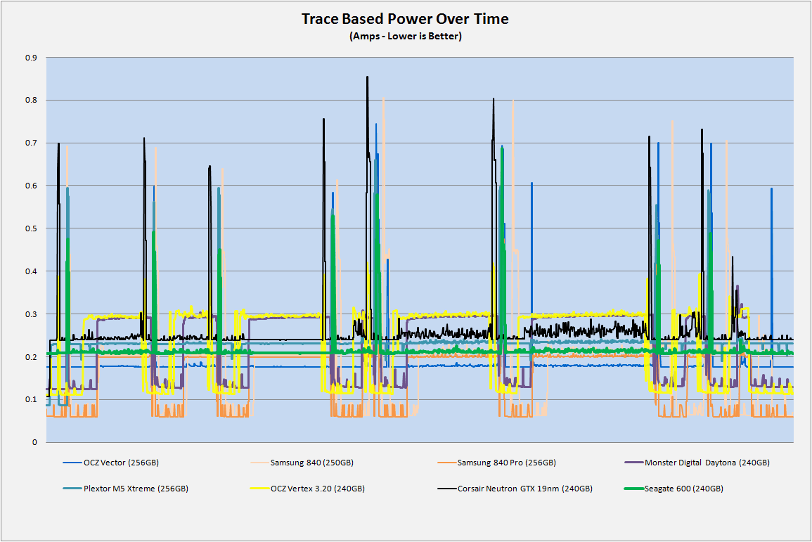 Далее показаны результаты теста энергопотребления накопителя в PCMark Vantage, демонстрируется "аппетит" и в простое и в нагрузке: