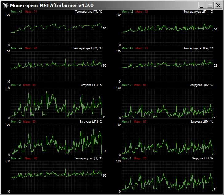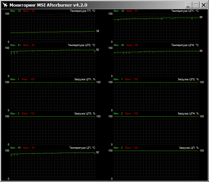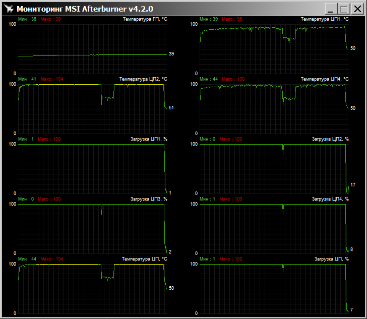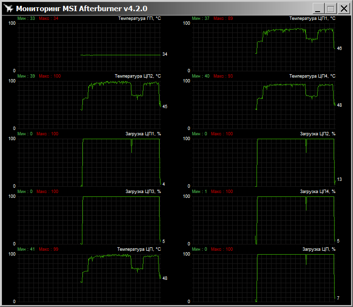 Как видно, Macho справился со всеми задачами, кроме LinX, тут по одному ядру была достигнута температура в 97 градусов по Цельсию (MSI Afterburner демонстрировал ещё более высокую t°), в ходе теста процессор стал троттлить (снижать тактовую частоту из-за чрезмерного нагрева).