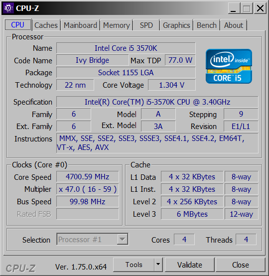 Хмм... а зачем тянуть, давайте узнаем как справляется сей пенсионер с Core i5-3570K (4.7ГГц, 1.304V)? Скриншот CPU-Z: