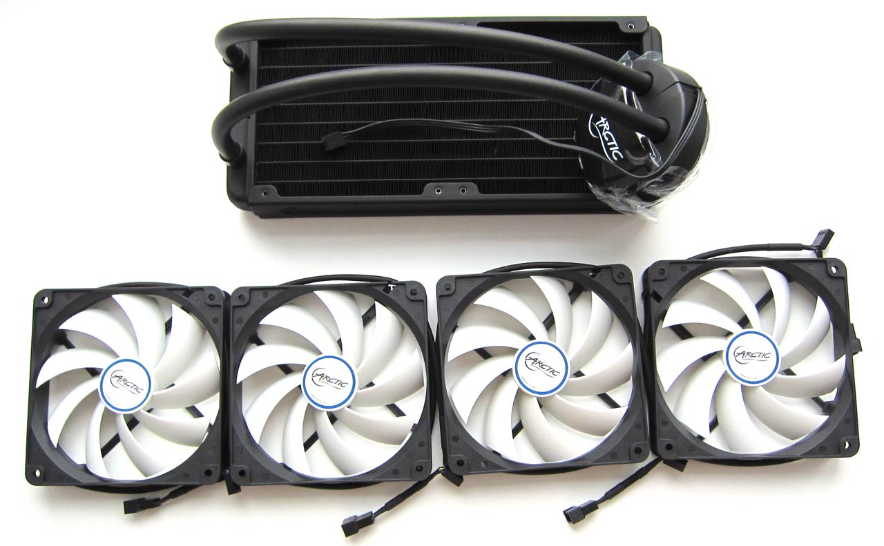 На фото четыре используемых 120мм вентилятора PWM PST, каждый в индивидуальном прозрачном пакетике, также нельзя не заметить 240(272)x120x38мм радиатор.