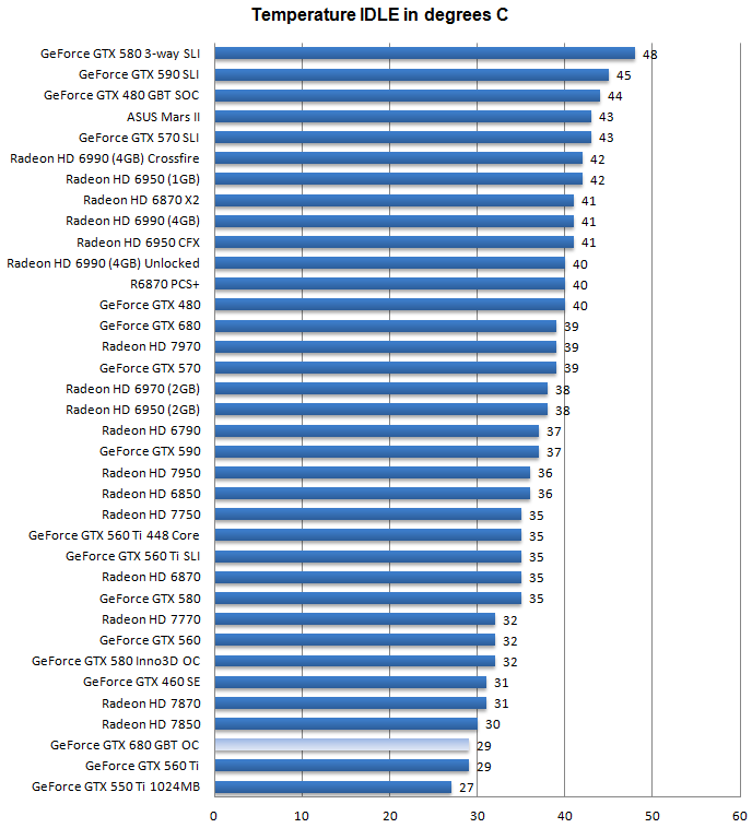 Поглядим, насколько хорошо / плохо выглядит Gigabyte GeForce GTX 680 OC Edition на фоне прочих карт в плане энергопотребления: