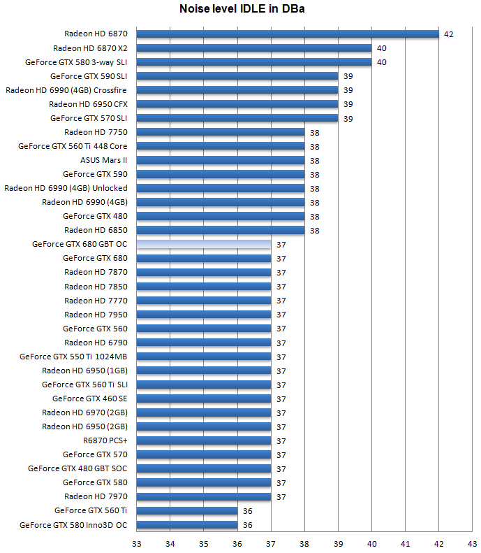 Уровень шума, издаваемый системой охлаждения видеокарты Gigabyte GeForce GTX 680 OC Edition