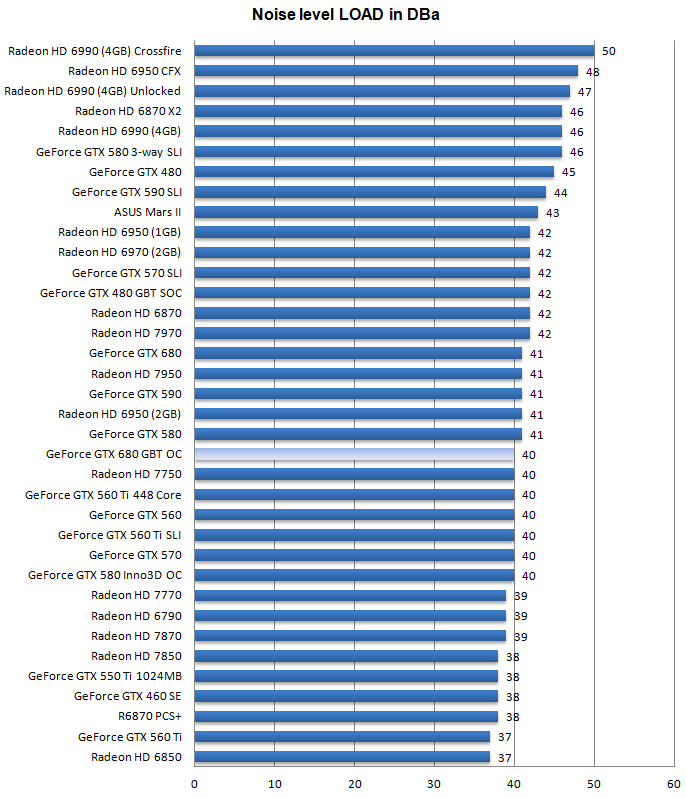В нагрузке WF 3X работает на 1 децибел тише, чем референс GTX 680.