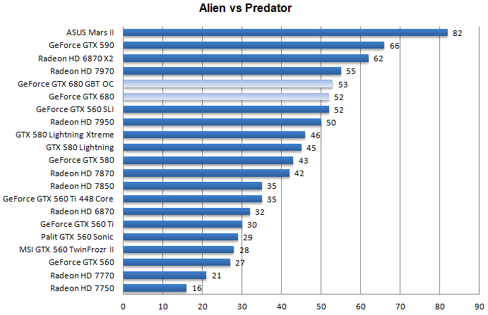 Разумеется, раз карточку погнали, то неплохо бы посмотреть на то, как она в таком состоянии выступит. Традиционно, тест проводится в следующих приложениях: Crysis 2, 3DMark 11 и Aliens vs Predator. Смотрим результаты: