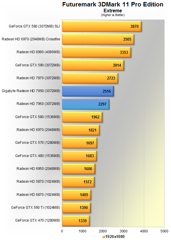 Сообщается, что Gigabyte Radeon HD 7950 на 10% шустрее референсной карты в 11-м "Марке" на пресете Extreme, и на 8% медленнее HD 7970, при том GTX 580 отстаёт от неё на 28%.