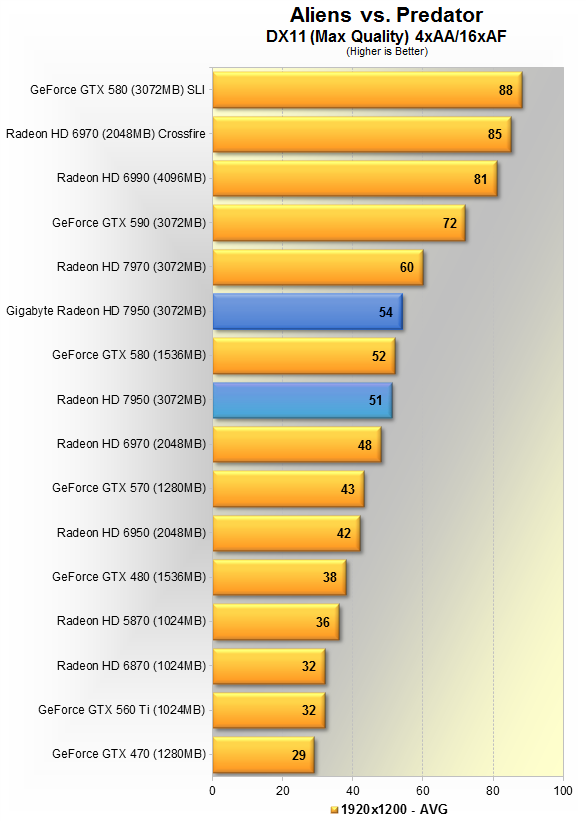 Тут разница между эталонной HD 7950 и разогнанной от Gigabyte довольно мала - 3%. От старшего решения карточка отстаёт на 6%, GTX 580 обгоняет на 11%.