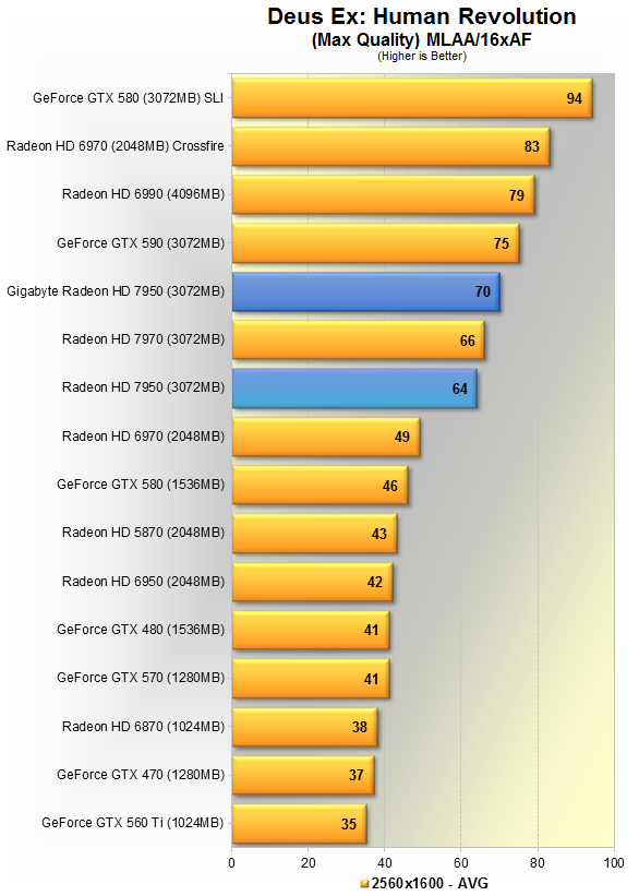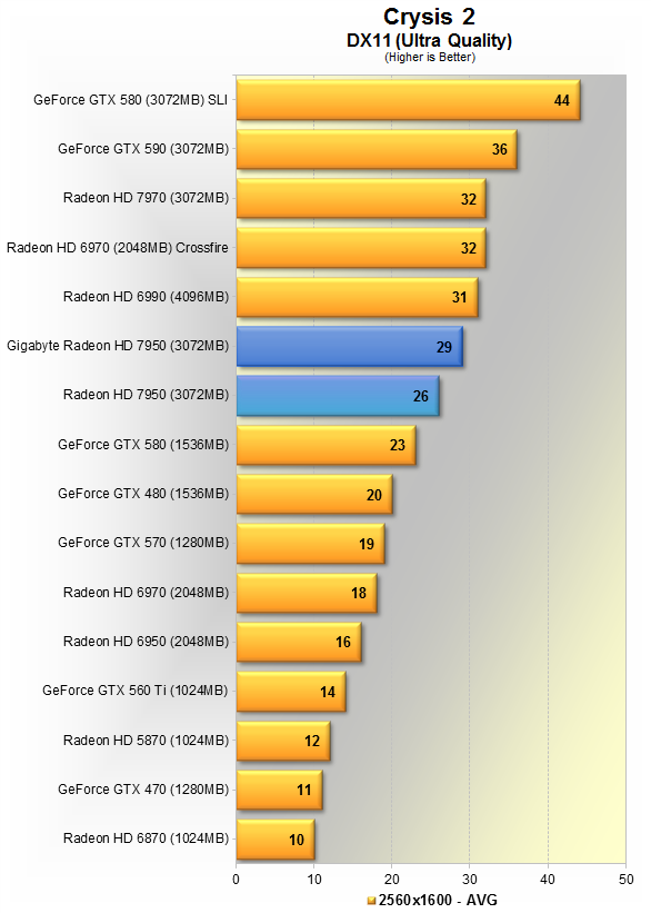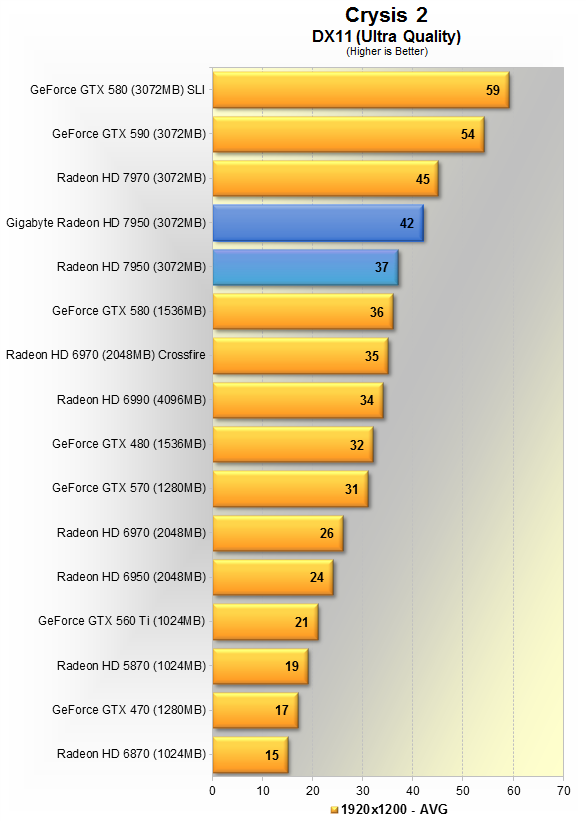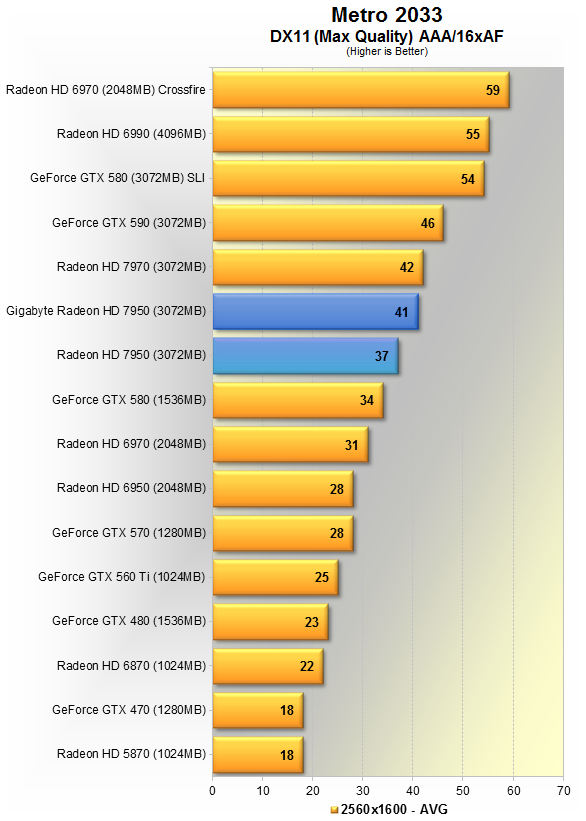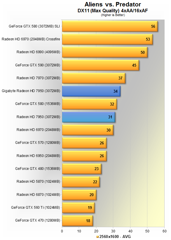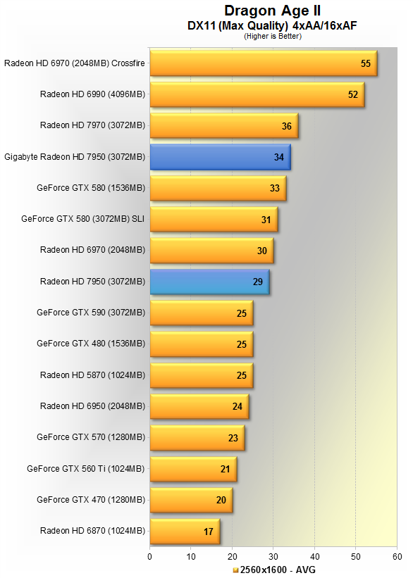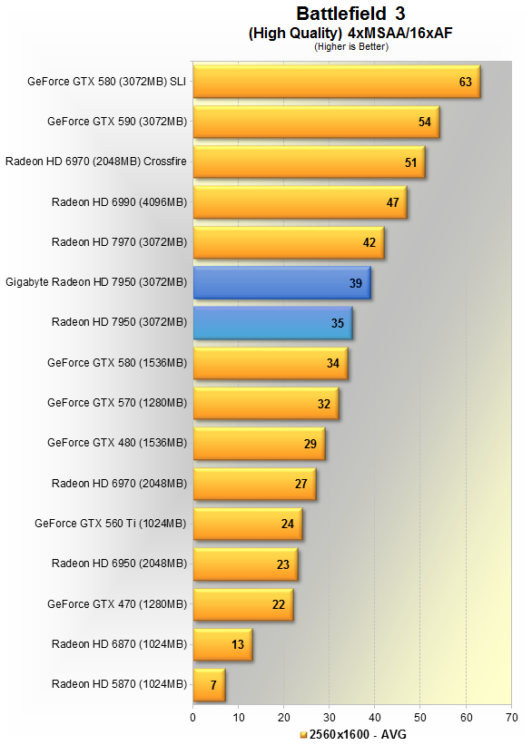 Новинка от Gigabyte показывает в среднем 34 кадра в секунду, вновь оказывается на 8% медленнее HD 7970, зато на 10% быстрее эталонной 7950, и всего на 6% шустрее GTX 580.