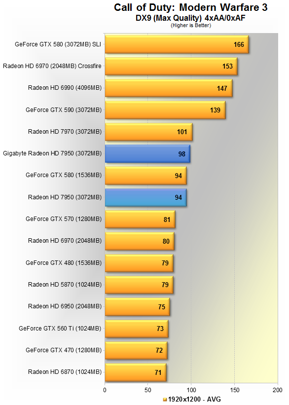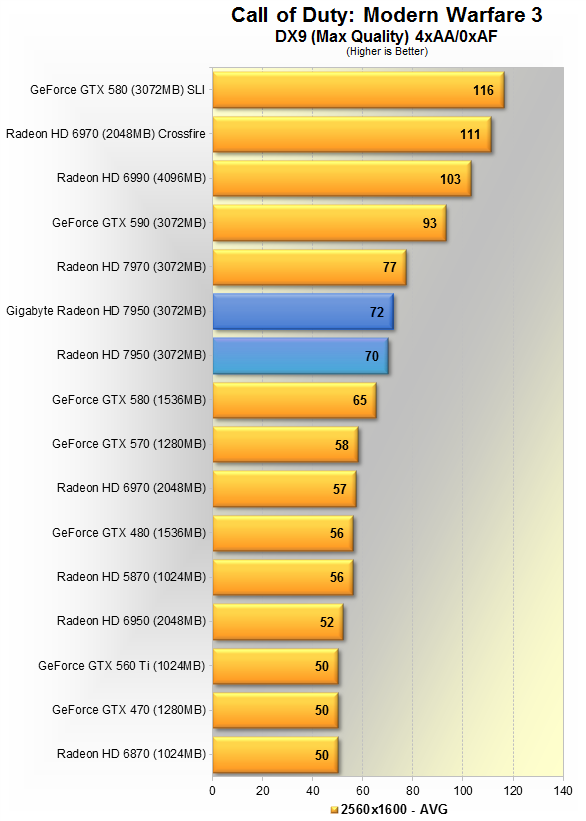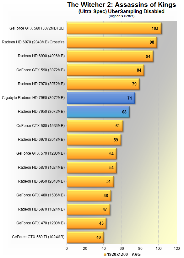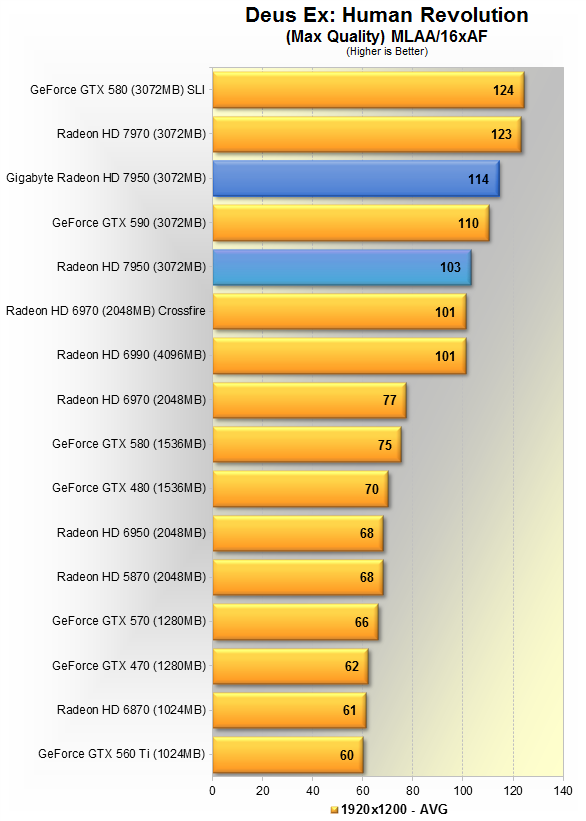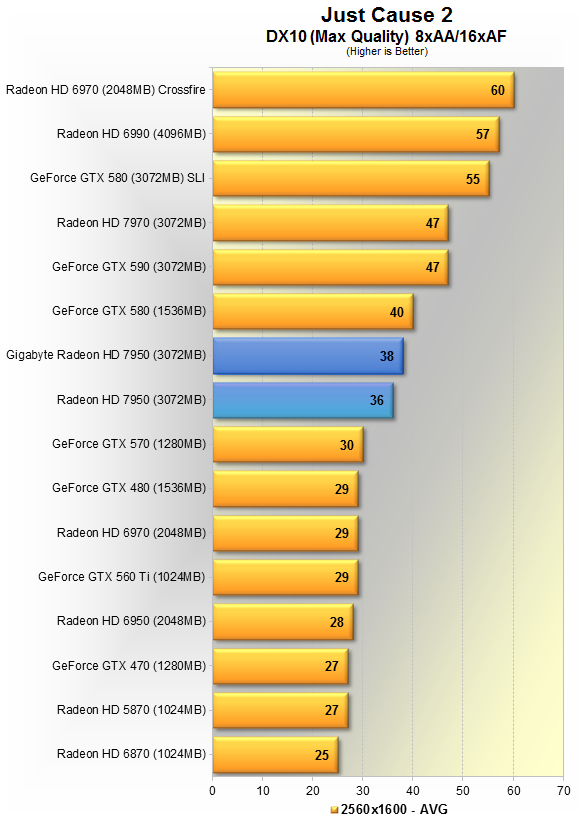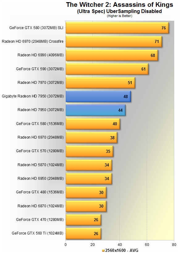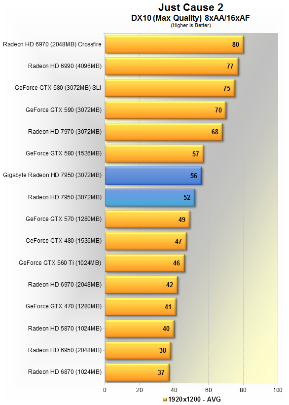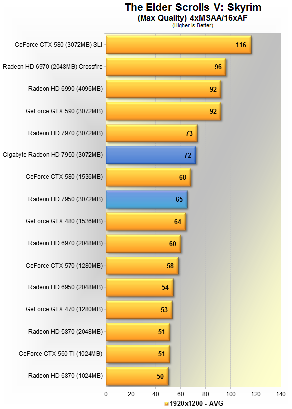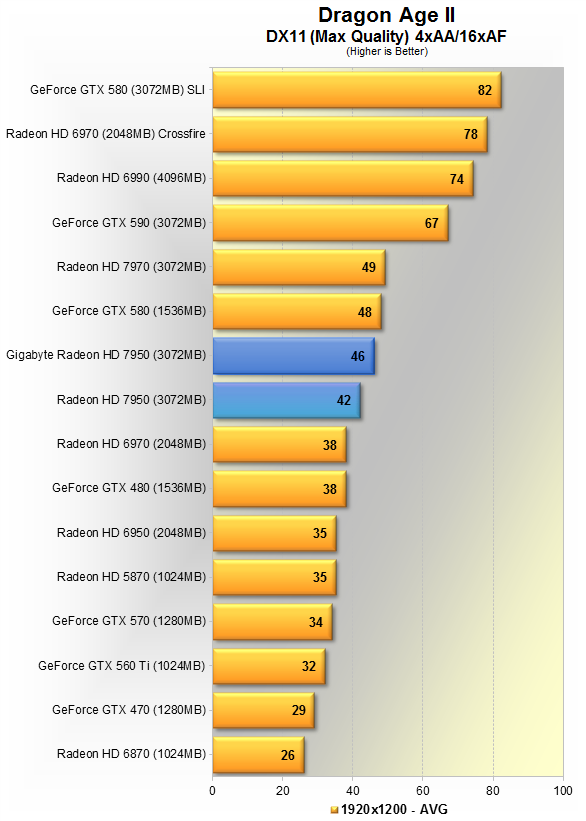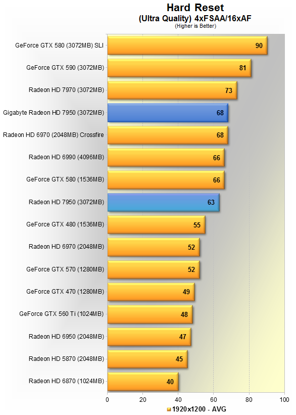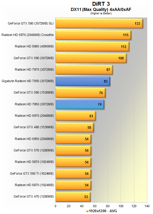 Тут видно 5% преимущество продукта Gigabyte над AMD'шным эталоном. Данная игра явно любит больше карты Nvidia, потому впервые в данном материале, GTX 580 вырывается вперёд, но всего на 5%. HD 7970 недосягаема, её производительность выше HD 7950 в разгоне на 19%.