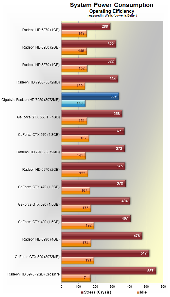 Заводской разгон продукта Gigabyte увеличил энергопотребление решения, но незначительно. В общем и целом, показатель вполне себе хорош, ведь карточка кушает даже меньше куда более медленного GeForce GTX 560 Ti.