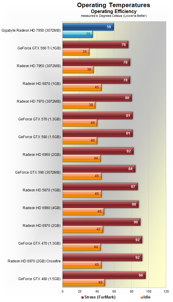 О карточке от Gigabyte говорится, что она на 10% быстрее эталонной. А в разгоне даже без повышения напряжения на ядре, HD 7950 получает уровень производительности равный, а в некоторых случаях и превосходящий, HD 7970. Кулер показал себя отлично - работал тихо, а t° держал невысокую.