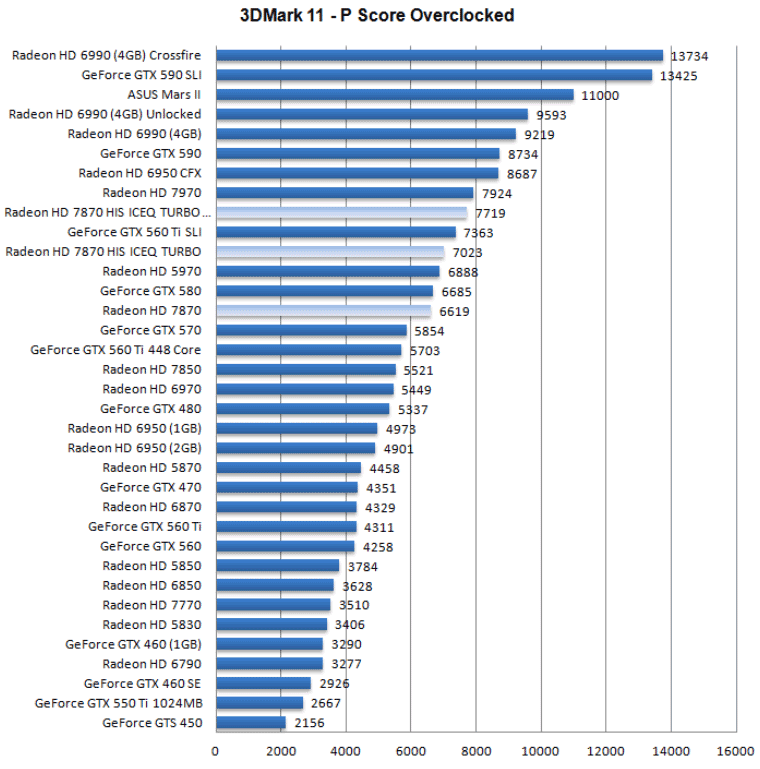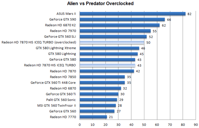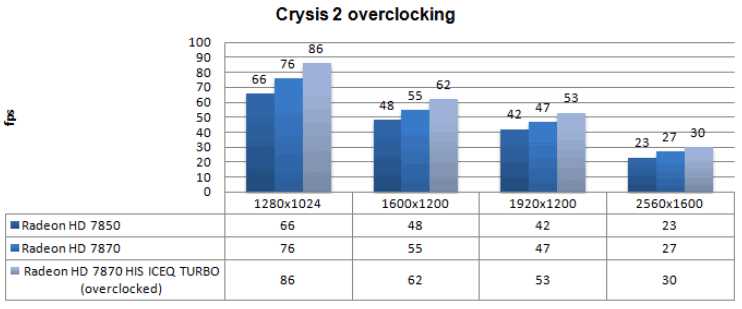Теперь поглядим на небольшое тестирование разогнанной видеокарты от HIS. Для теста вновь были выбраны следующие приложения: Crysis 2, 3DMark 11 и Aliens vs Predator. Вот результаты: