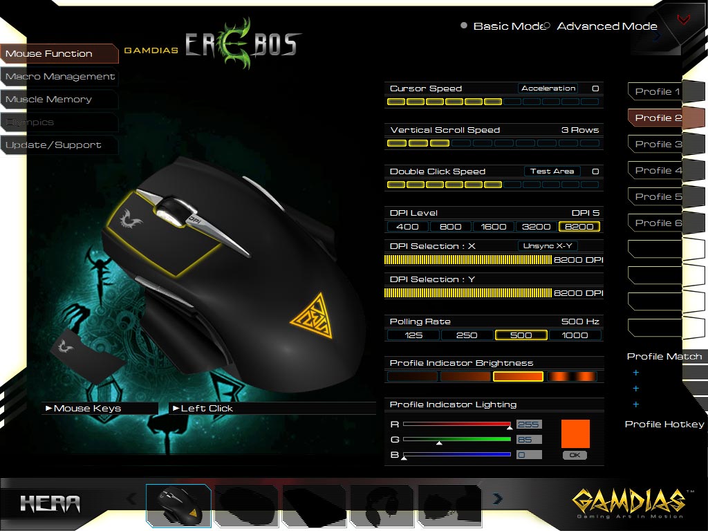 Всё на том же первом экране можно выбрать частоту опроса сенсора, для наиболее плавного скольжения курсора рекомендуется выставлять 1000Гц при высоком показателе DPI. Как цвет подсветки, так и её яркость можно регулировать там же, яркости доступно три режима (высокая, слабая и полное отсутствие подсветки), плюс один в котором яркость то возрастает, то убывает. Если по изображению мышки, по различным её кнопкам, покликать, можно изменить функционал клавиш, в том числе отключить ненужные, что лично мне очень понравилось. В Profile Match можно задавать автоматическую загрузку того или иного профиля под определённую игру. Также, можно задать смену профилей через любую клавишу на клавиатуре, очищается поле ввода на пустое нажатием Backspace.