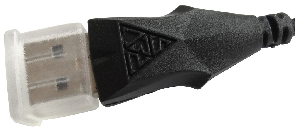 USB кабель мышки сдерживается лентой с липучкой, имеющей на себе название компании-производителя изделия, есть смысл её использовать, если все 2 метра длины провода кажутся излишними: