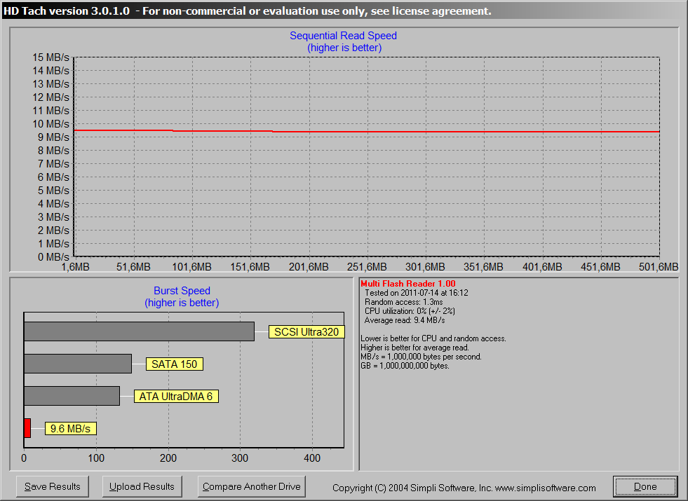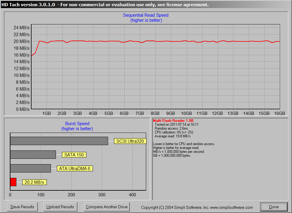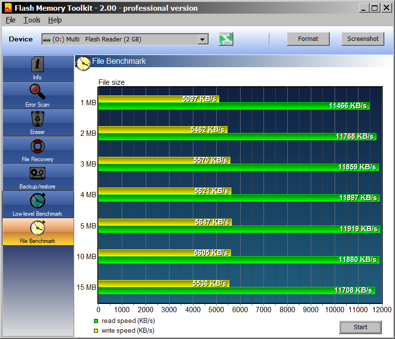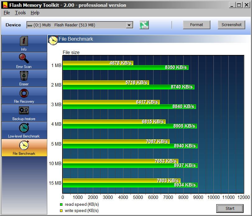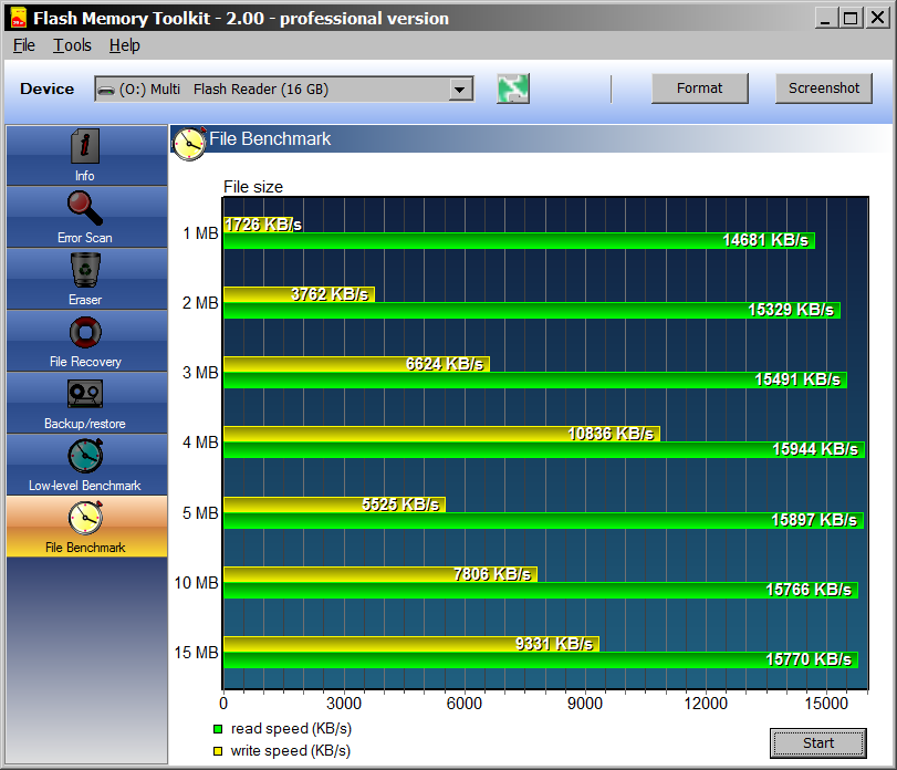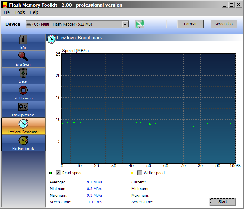 Довольно хороший софт для флешек и карточек памяти, помимо диагностических и ремонтных функций он имеет возможность тестировать накопители, как на низком уровне, так и через файловую систему. Первым я прогнал низкоуровневый тест чтения. Аналогичный тест записи я не запускал, т.к. он грозился форматировать карты памяти, а делать мне этого в момент проведения теста не хотелось (на карточках были данные, а времени на перезаписывание их туда-сюда не было).
