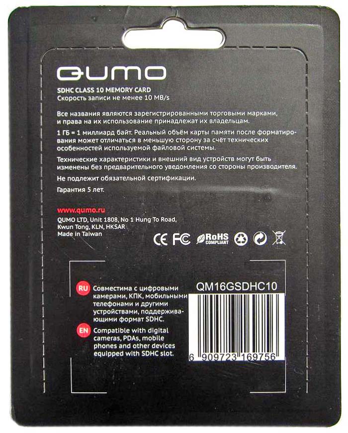 Так как продукция компании QUMO изначально нацелена на рынок стран бывшего СССР, вся информация о карточке памяти, что доступна на обратной стороне упаковки, изложена на русском языке: