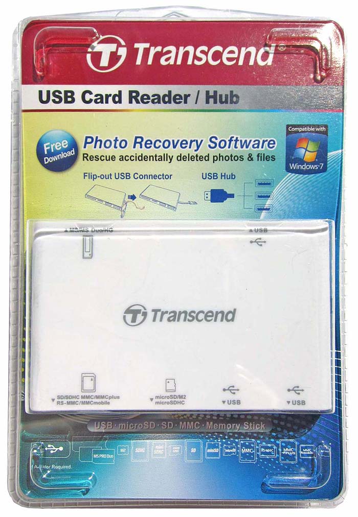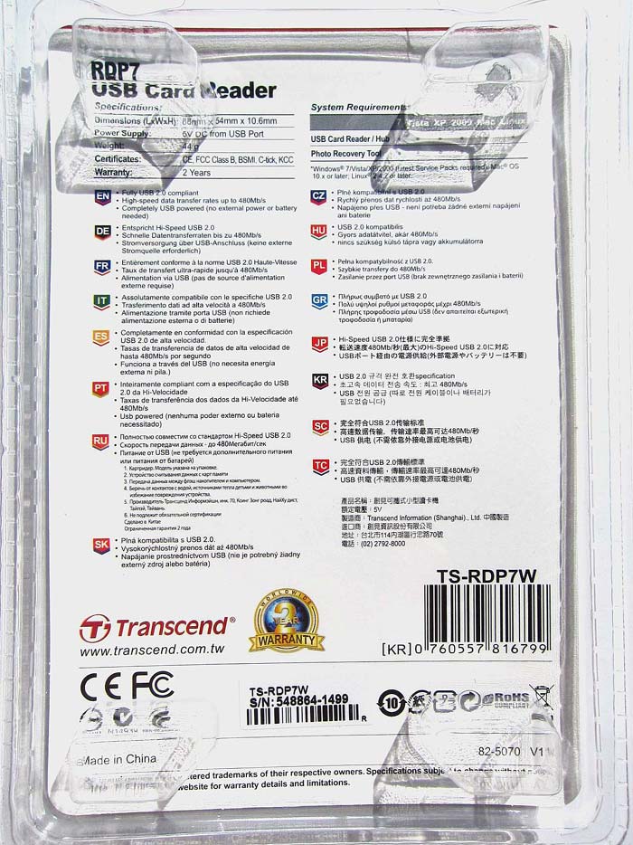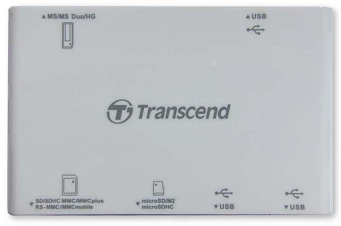 Но оказалось, что картридер слишком уж преклонного возраста и потому не читает формат карточек SDHC. Я принял решение прикупить нечто поновее. Из доступных мне по деньгам и территориально агрегатов, я выбрал картридер Transcend TS-RDP7W, полюбуйтесь на его упаковку (также блистер):