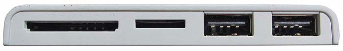 В инструкции сказано, что данный картридер может служить и USB 2.0 хабом, единственное ограничение - нельзя подсоединять к нему внешние накопители без дополнительного питания. Количество одновременно поддерживаемых карточек памяти - всего одна штука, т.е. если всунуть две, то определится лишь одна.