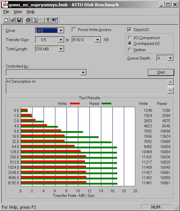 Первым на очереди идёт известный нам по обзорам твердотельных накопителей бенчмарк ATTO версии 2.47.