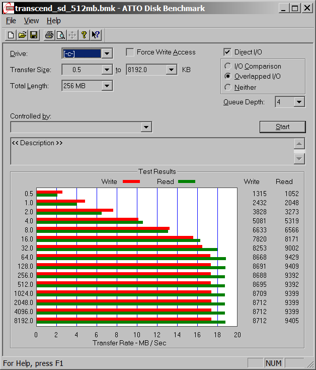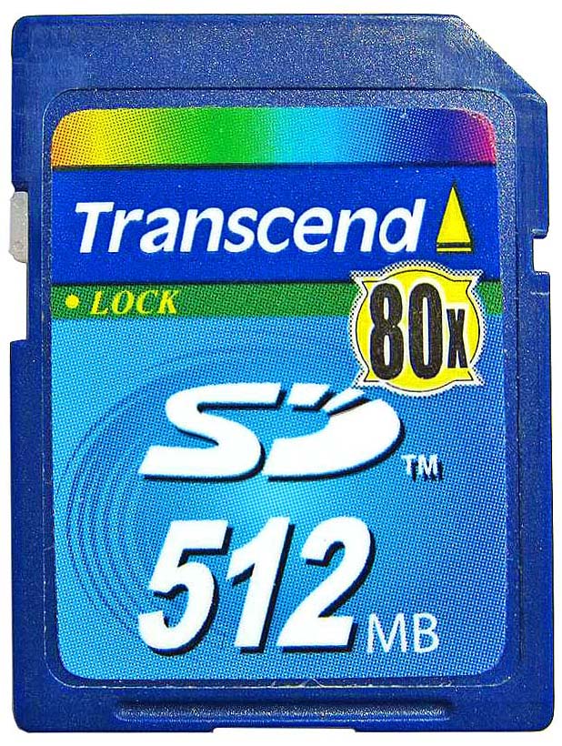 А вот с кем предстоит сразиться карточке от QUMO, это старый флэш-носитель формата SD от Transcend, его ёмкость - 512МБ. Им я пользовался года эдак с 2005, скорость устройства обозначена значением 80х.