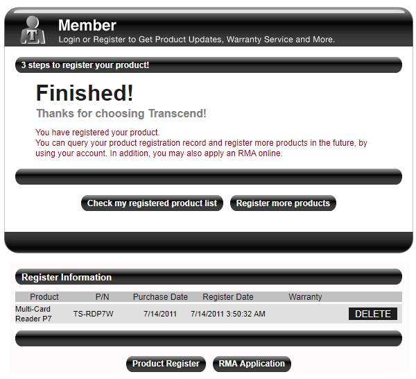 ), я понял, что гарантию можно некоторым образом расширить, если в течении 30 дней после покупки зарегистрировать устройство на сайте Transcend (предварительно нужно зарегистрироваться самому). Я решил зарегистрироваться и вот результат:
