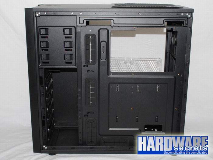 Обе боковые стенки держатся на чёрных винтах. В поддоне для системной платы огромное отверстие, служащее для установки кулера с бэкплейтом, без необходимости демонтажа "материнки". Также, на фото можно рассмотреть прорезиненные отверстия для организации укладки кабелей (опять же, за поддоном материнской платы).