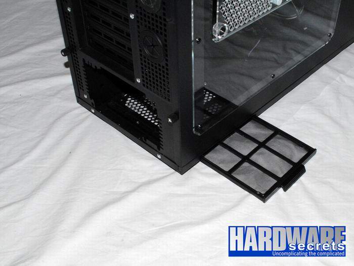 Тут нам показан съёмный пылевой фильтр, находящийся под блоком питания. Говорят, что его легко доставать для очистки, тем более что делается это с левой стороны корпуса (а не с задней, как в некоторых продуктах от конкурентов Antec).