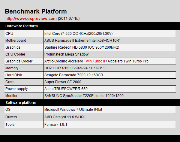 Довольно странный выбор, я бы взял что-нибудь погорячее (видеокарту с более крутым нравом/более высокими рабочими температурами). Для теста карточку разогнали до частоты 960/1260МГц (ядро/память) и нагревали FurMark'ом. С реферерсной системой охлаждения температура ядра дошла до 90 градусов по Цельсию, посмотрим как выступят продукты Arctic при тех же самых условиях.