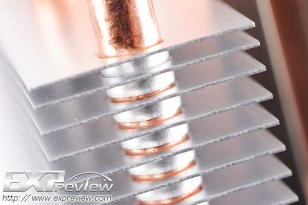 На фотографии ниже показано, как теплотрубка контактирует с алюминиевыми пластинами радиатора: