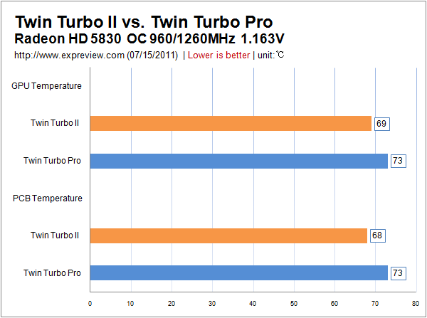 Дополнительная теплотрубка (а также другие изменения в конструкции) помогла Twin Turbo II отвоевать 4 градуса по графическому ядру у Twin Turbo Pro, а разница в температуре печатной платы ещё ощутимей - 5° по Цельсию. Во время теста скорость вентиляторов новинки составляла 29% от их максимума, а у бывшего чемпиона "карлсоны" трудились немногим быстрее - 30%. И в том и в другом случае система охлаждения работала чрезвычайно тихо.
