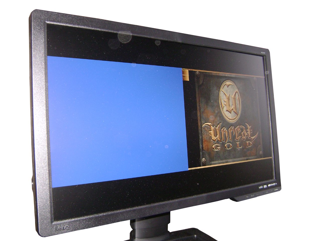 На левой части монитора изображения нет, т.к. HDMI кабель (источник дополнительного сигнала) не подключен, а на правой выводится игра Unreal Gold, которую я запустил на момент съёмки.