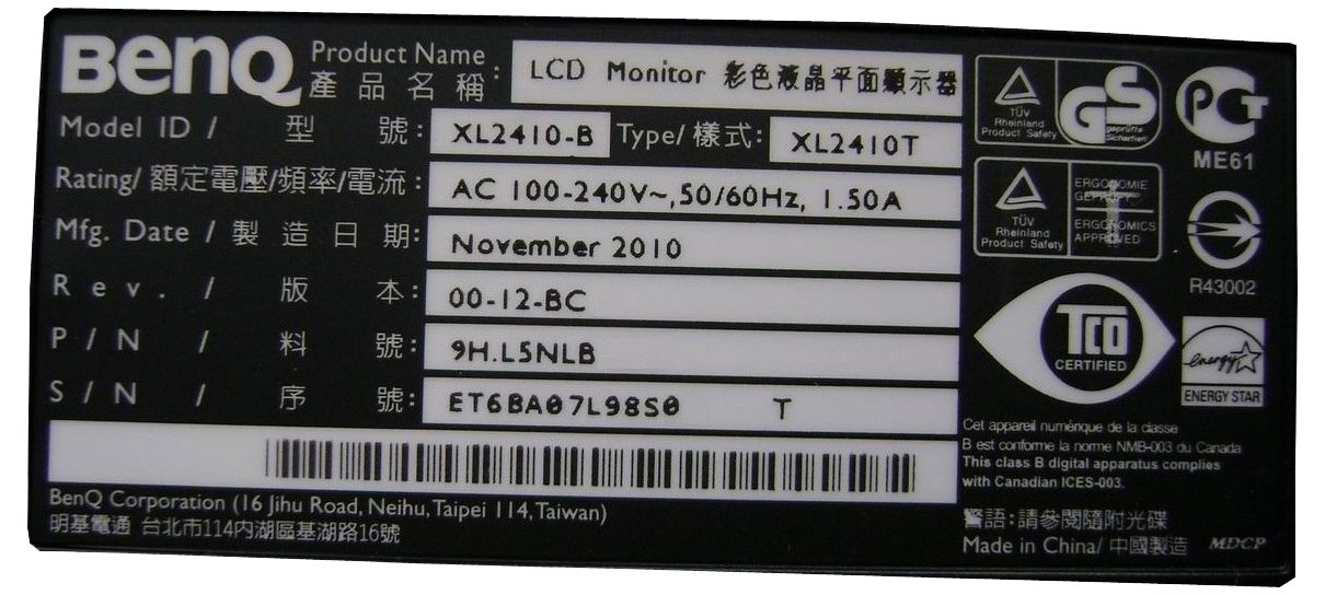 Стикер выше содержит кое-какие спецификации монитора, прочтя которые становится понятно, что месяц изготовления девайса - ноябрь 2010 года, а сделано устройство в Китае (а сама компания тайваньская).