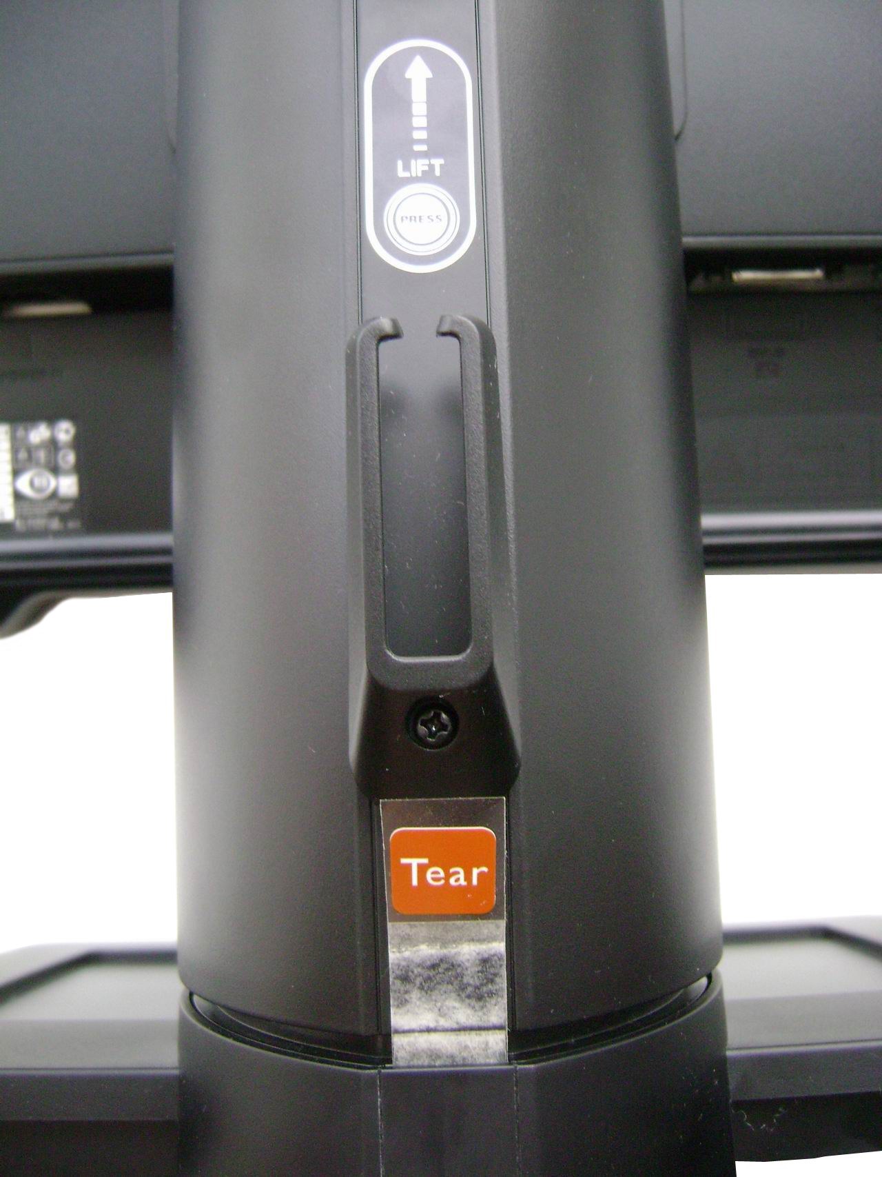 А вот и злосчастная липучка с надписью "Tear". Её функция - не позволять монитору (пока он находится в коробке для транспортировки) самопроизвольно вытягиваться в высоту на своей хитроумной подставке. Я, по глупости, забыл её отлепить, когда распаковывал монитор и потому позже долго ругался на "проклятую" подставку - мол, как сложно регулировать высоту экрана, руки бы оторвать тем умельцам, что такое творят