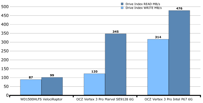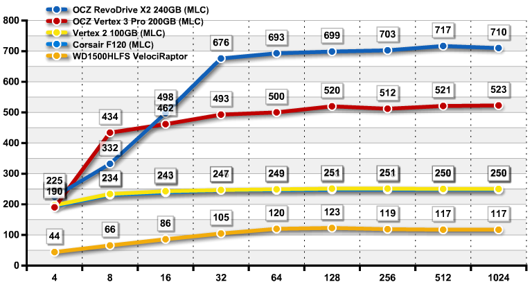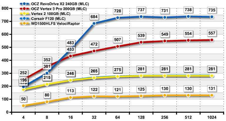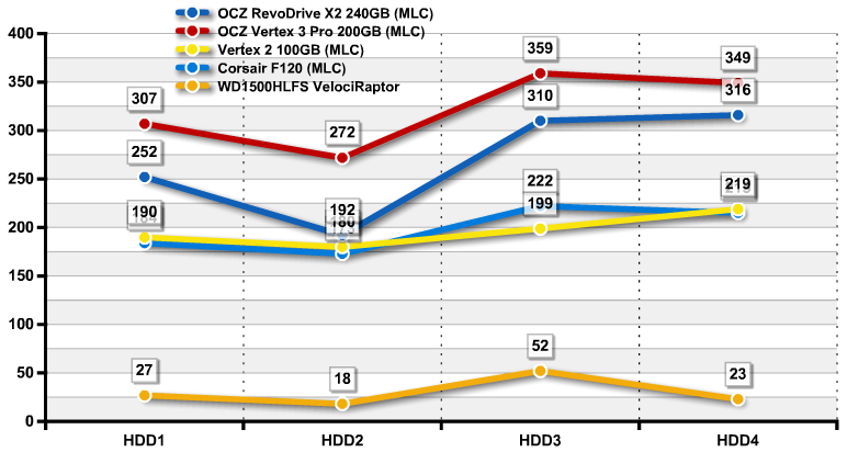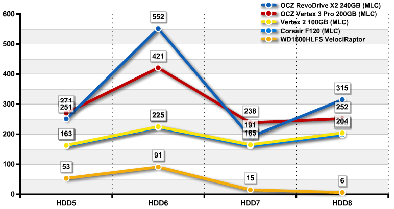 Тут мы наблюдаем ситуацию, что увидим ещё не раз - Vertex 3 PRO и RevoDrive 2X лидируют по всем статьям, остальным SSD и уж тем более "Велоцираптору" до них далеко.