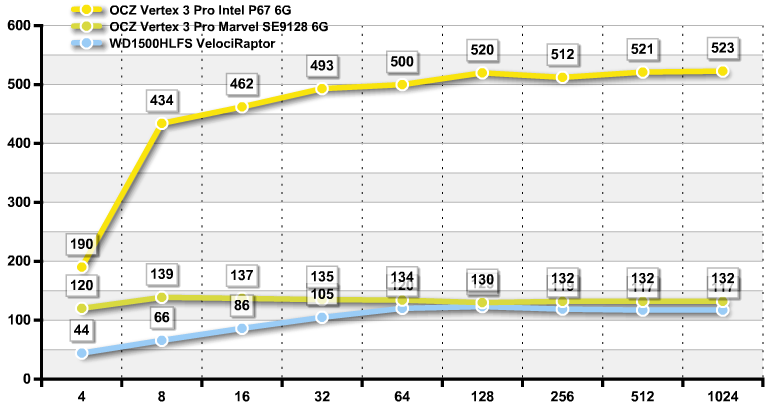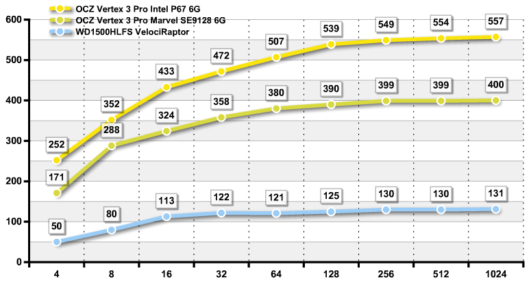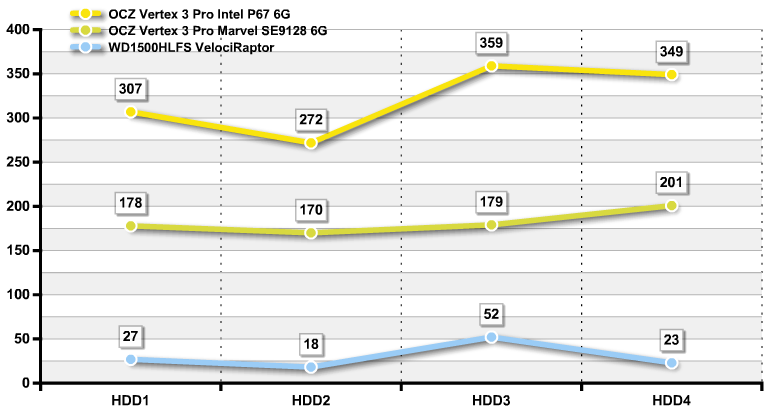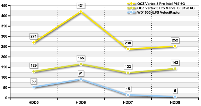Тут и далее, на графиках светло-жёлтой линией обозначена производительность OCZ Vertex 3 PRO, подключенного по Intel'овскому контроллеру SATA 6Гбит/с, а грязно/тёмно-жёлтой - подключенного по Marvell SE9128. Думаю, что можно обойтись без комментариев, результаты говорят сами за себя.