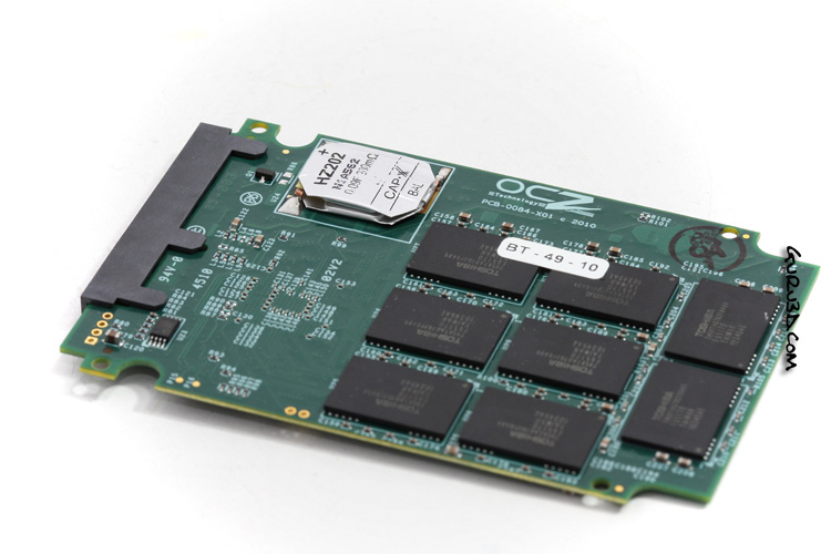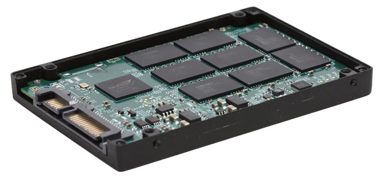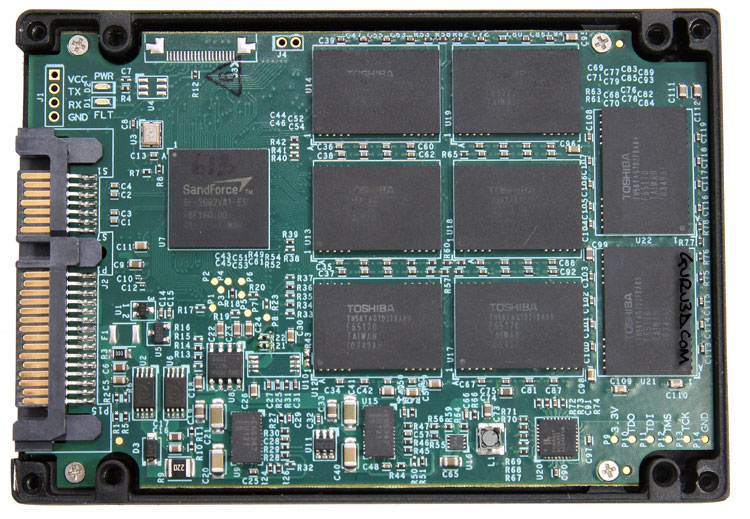 На фото выше мы можем видеть сам контроллер от SandForce (он слева на фото) в компании восьми чипов памяти от Toshiba.