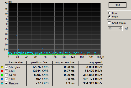 Результат случайной записи блоками по 4КБ очень впечатляет - 54МБ/с! А блоками по 1МБ - 402МБ/с, тоже недурственно. Представьте себе - накопитель может записывать 400 файлов размером 1МБ каждый каждую секунду. Правильно, что автор оригинального материала заострил на этом внимание - меня лично такие вещи реально поражают.