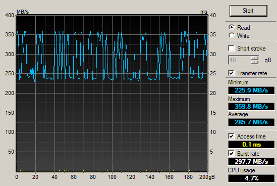 Данный тест всегда показывает всё в таком свете, что даже самые быстрые SSD выглядят не лучшим образом. Результат по записи - 285МБ/с, а по чтению - 360МБ/с максимум.