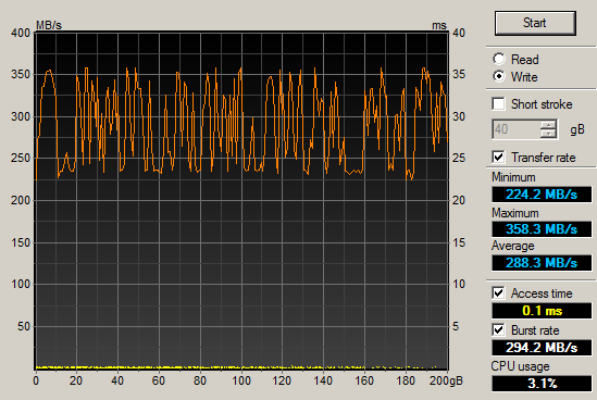 Результат в тесте записи, в среднем, находится на уровне 288МБ/с, пиковое значение - 358МБ/с. Можно сказать, что устройство выступает неудачно, однако если вспомнить о том, что RevoDrive с его заявленными скоростями в районе тех, что у OCZ Vertex 3 PRO, показал всего лишь 164МБ/с - то становится не так грустно.
