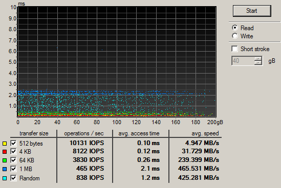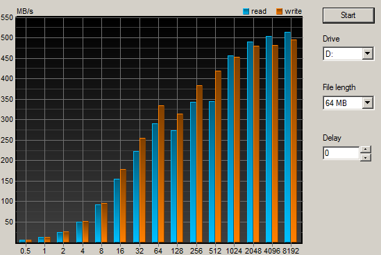 Суть теста - файл объёмом 64 мегабайта записывается блоками разного размера - от 0.5 до 8 мегабайт. Максимальные результаты очень впечатляют - пиковая скорость чтения достигла 525МБ/с, а записи - ~500МБ/с.