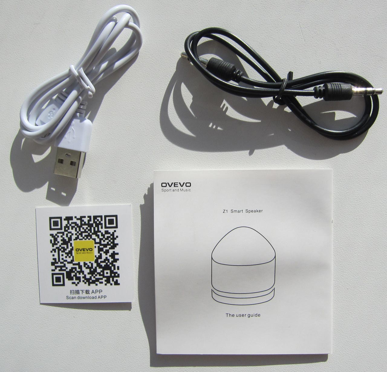 Девайс оснащён USB-Micro USB устройством для зарядки, кабелем 3.5-3.5мм для проводного подключения к различным устройствам, не обладающим поддержкой Bluetooth, инструкцией и QR кодом для скачивания приложения...