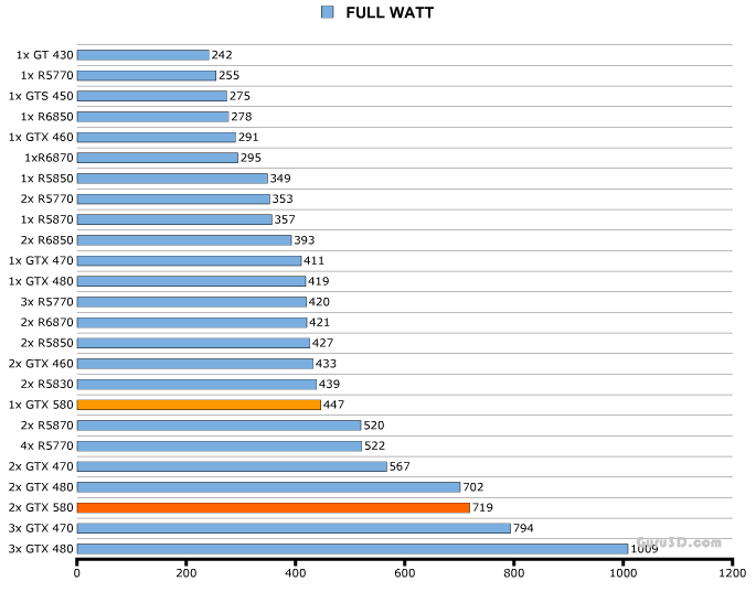 По идее, если одна GTX580 потребляла электроэнергии чуточку больше, чем 480-й Джифорс, то парочка новых флагманов будет ещё прожорливее.