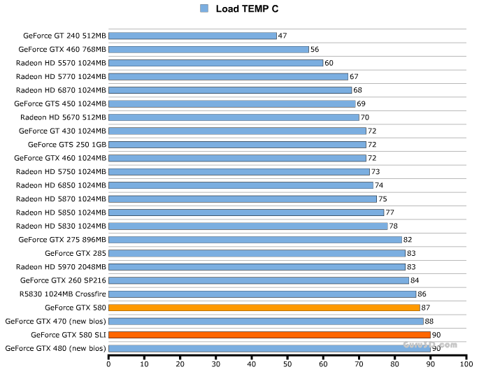 Итог - 719 ватт у пары 580-х против 702 ватт у парочки 480-х, ситуация вполне логичная. Как уже говорил Гилберт, более высокое энергопотребление новой видеокарты вполне может быть из-за не финальной версии BIOS, вшитого в его инженерные образцы GTX580.