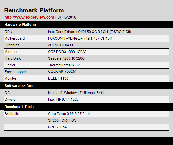 Как видно из таблицы, мы использовали процессор Intel Core 2 Extreme QX9650, горячий "паренёк" ! Комнатная температура во время тестов была около 26 градусов по Цельсию. Тестирование мы разделили на две части - в режиме без вентилятора и с ним. Прогрев процессора производился с помощью двух одновременно запущенных копий ORTHOS, прогревавших каждое ядро на протяжении 15 минут. После мы записывали температуры, потом уже отключали ORTHOS и 10 минут компьютер остывал, данные показатели также записывались. Показания снимались утилитой Core Temp. Во время тестирования корпус был закрыт (к слову - в данном шасси блок питания расположен снизу), а в нём трудились два 120мм вентилятора со скоростью вращения лопастей 1200 оборотов в минуту.