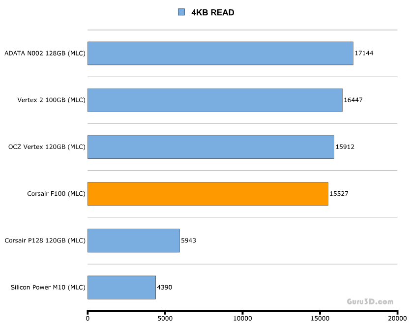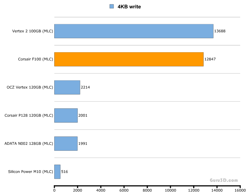 В тесте с случайной записью 4-х килобайтными файлами мы снова видим ТОЧНО такую же картину - SSD на SF-1200 лидируют без всяких оговорок. Corsair P128 (на контроллере от Samsung) и Vertex (Indilinx) показывают производительность в 2000 операций в секунду. На самом низу находятся Silicon Power M10 SSD с контроллером от JMicron controller (без кеша вообще) с показателем ввода/вывода 500 операций в секунду.