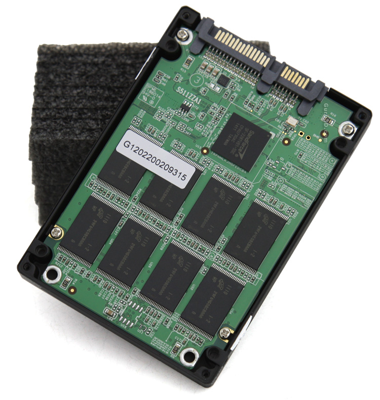На каждой стороне печатной платы расположено 8 чипов MLC NAND флеш памяти производства Micron.