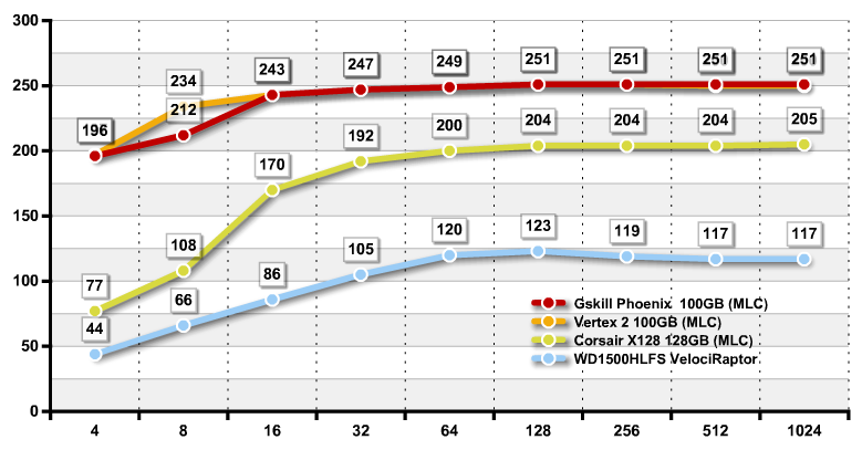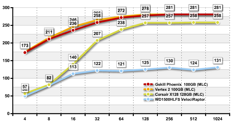 Наиболее сложным и важным заданием для любого устройства хранения данных является... быстрая запись очень маленьких файлов, так давайте начнём именно с этого теста. Мы проведём тестирование с блоками размером от 4 до 1024 килобайт в файле общим объёмом 256 мегабайт и посмотрим, что нам покажет новинка от OCZ. В тестировании принимали участие следующие девайсы :
